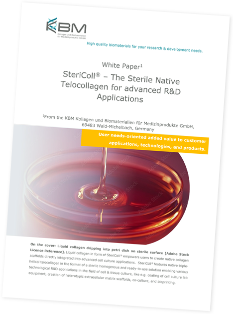 Due to its ready-to-use format as homogeneous collagen solution, and based on its native triple helical structure and fibril assembly performance, SteriColl® is a versatile high quality collagen for various advanced R&D applications where sterility is mandatory.